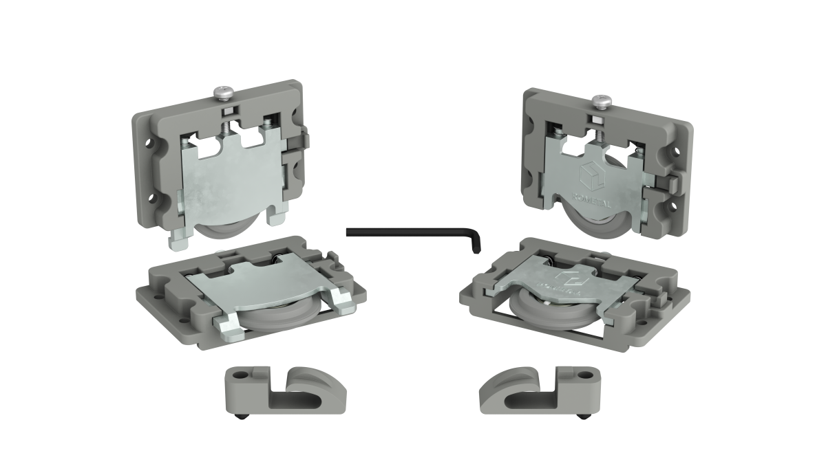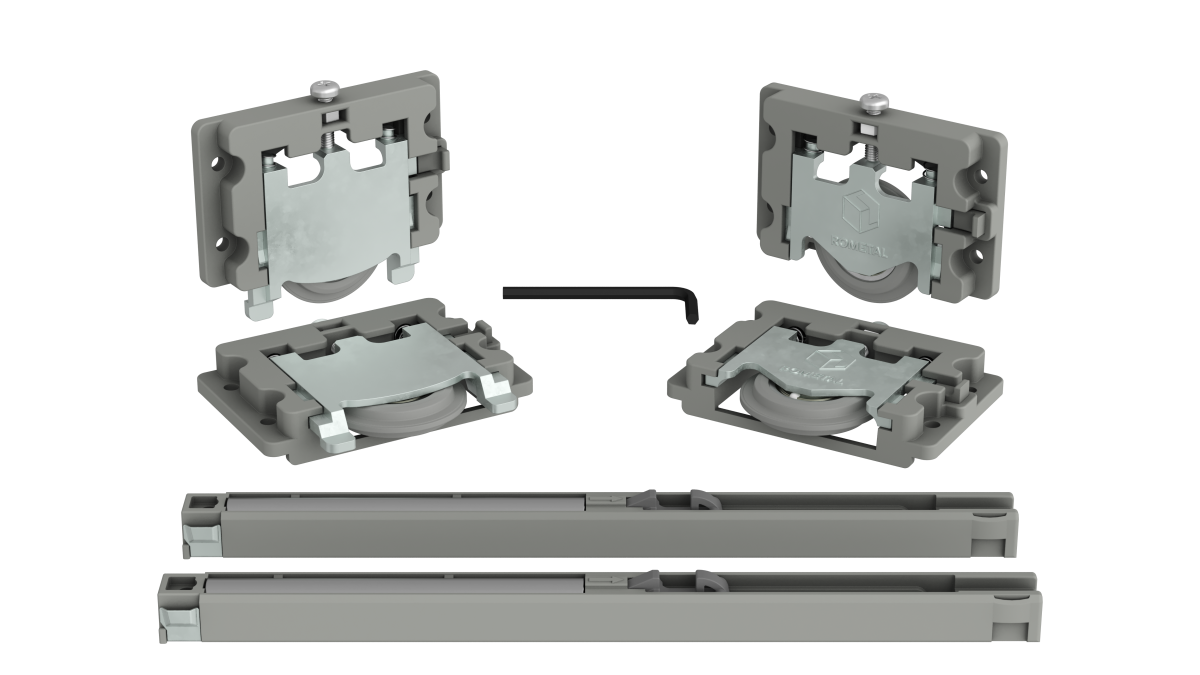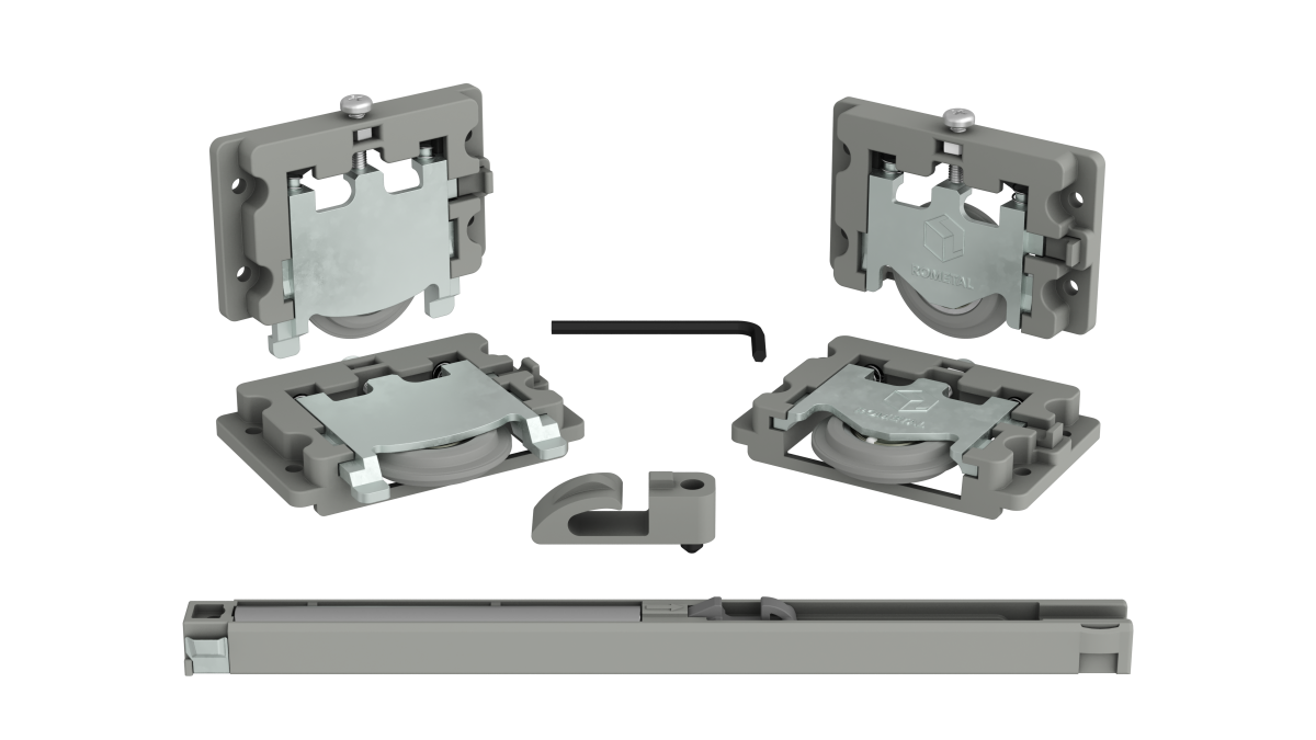 Sistema deslizante de sustentação na base. O sistema Flow S possui aplicação sobreposta, facilitando a instalação e dispensando usinagem na porta do móvel.
