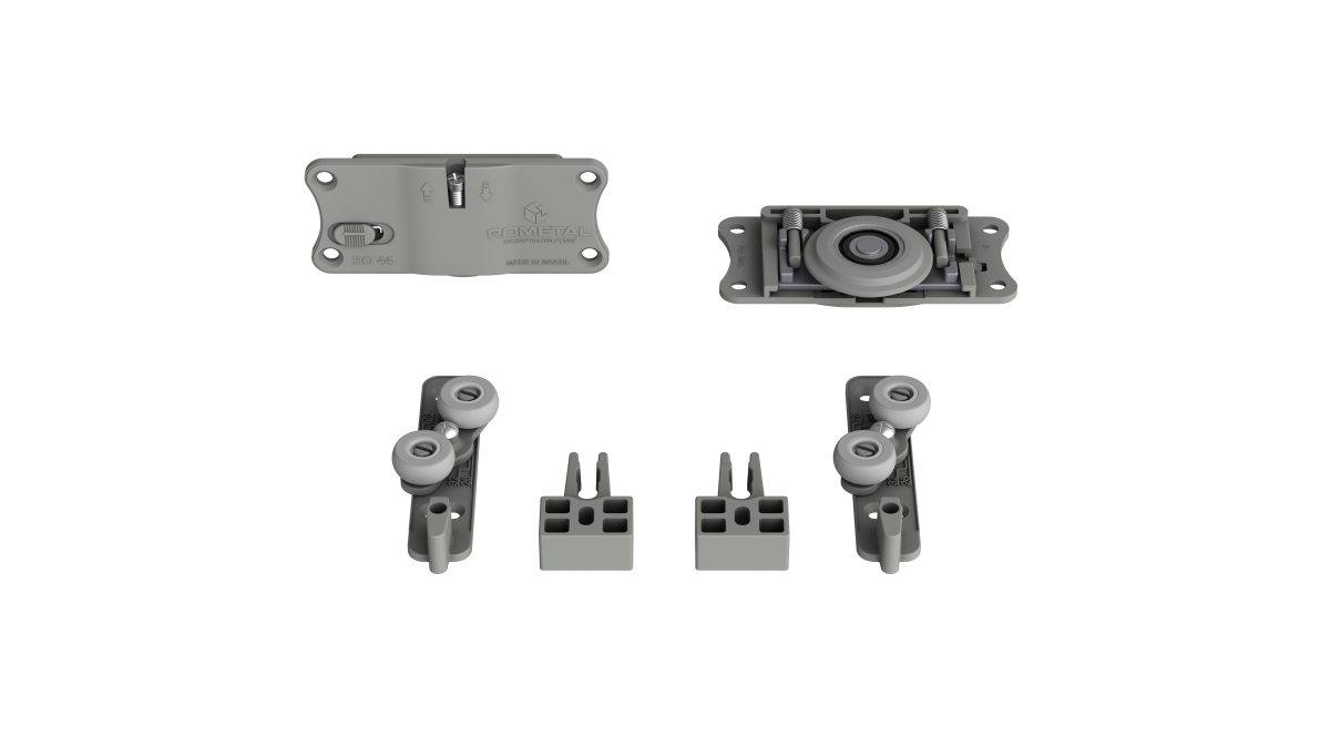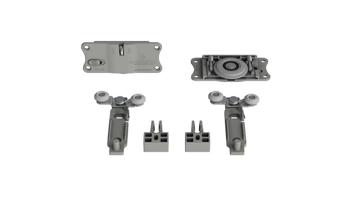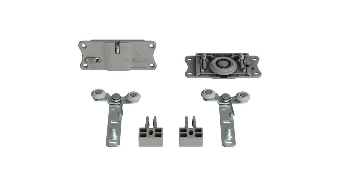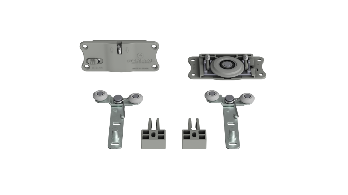 Sistema com regulagem fácil e prática. Possui molas antidescarrilamento e pode ser utilizada em portas de até 60 kg.