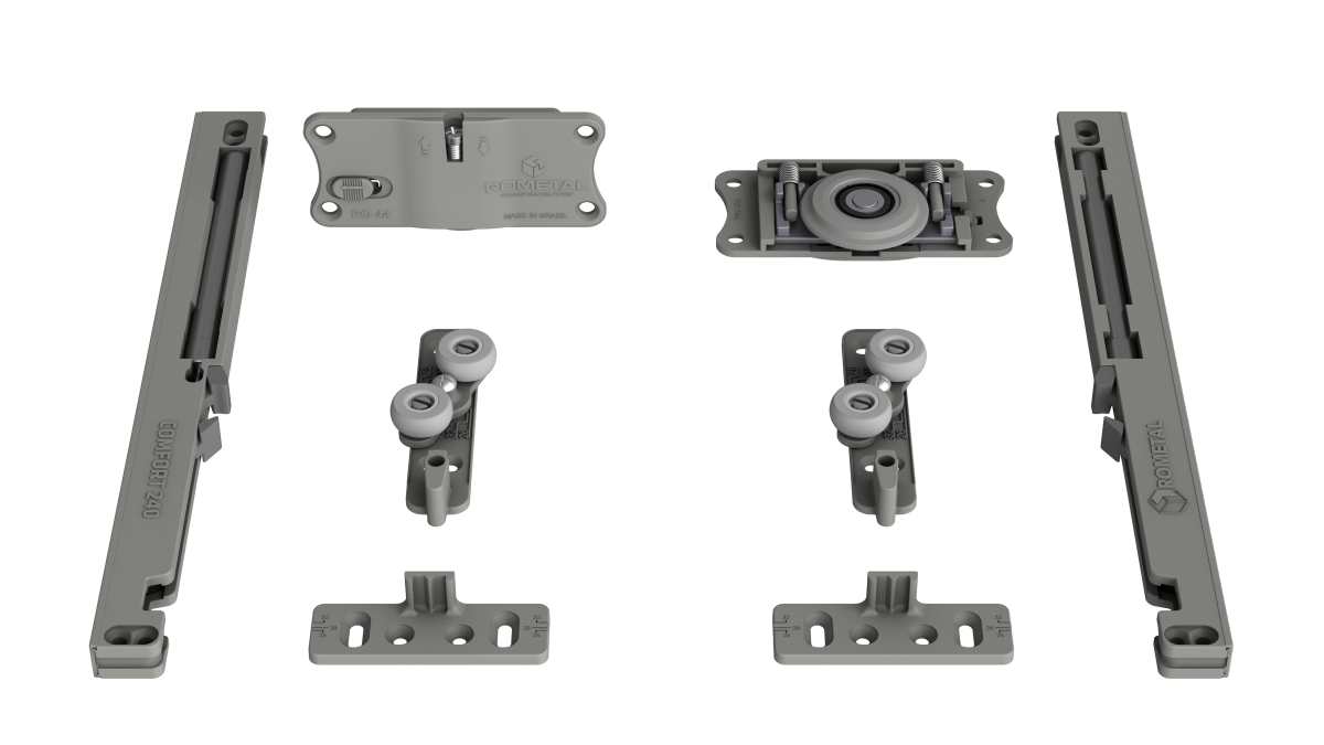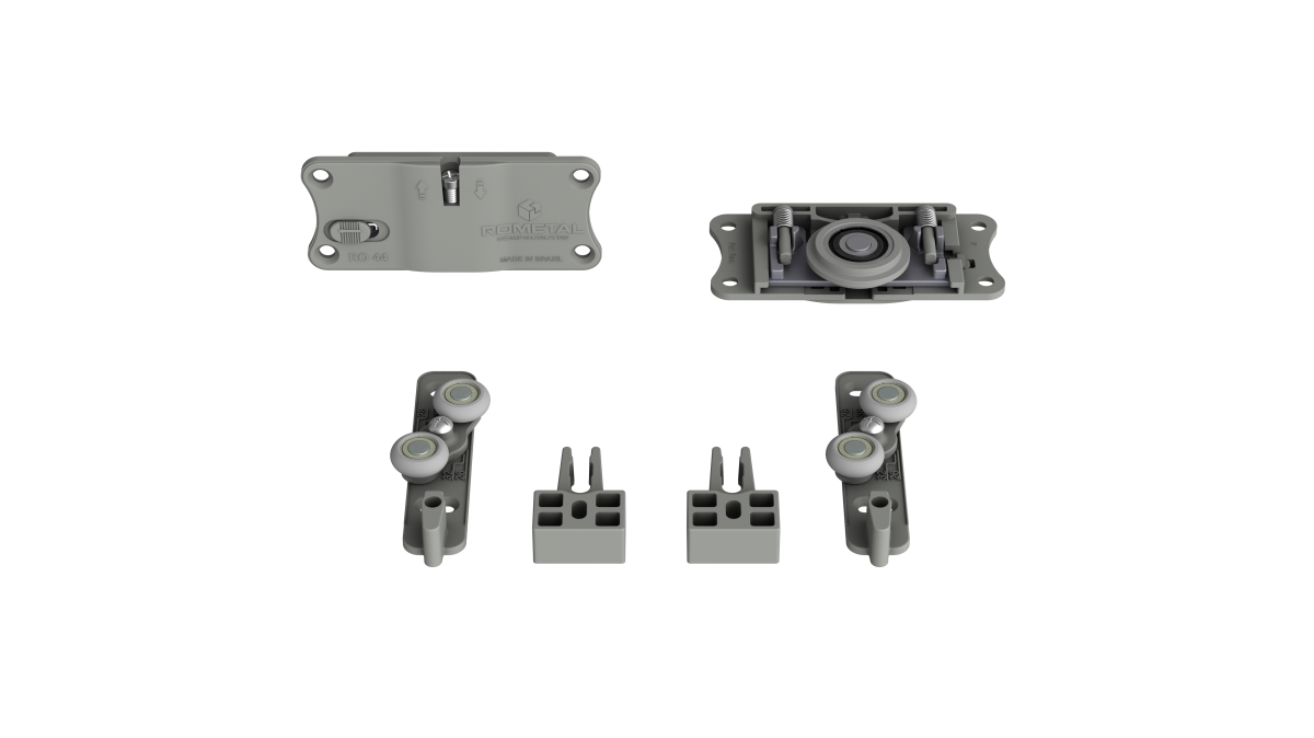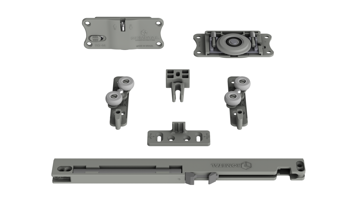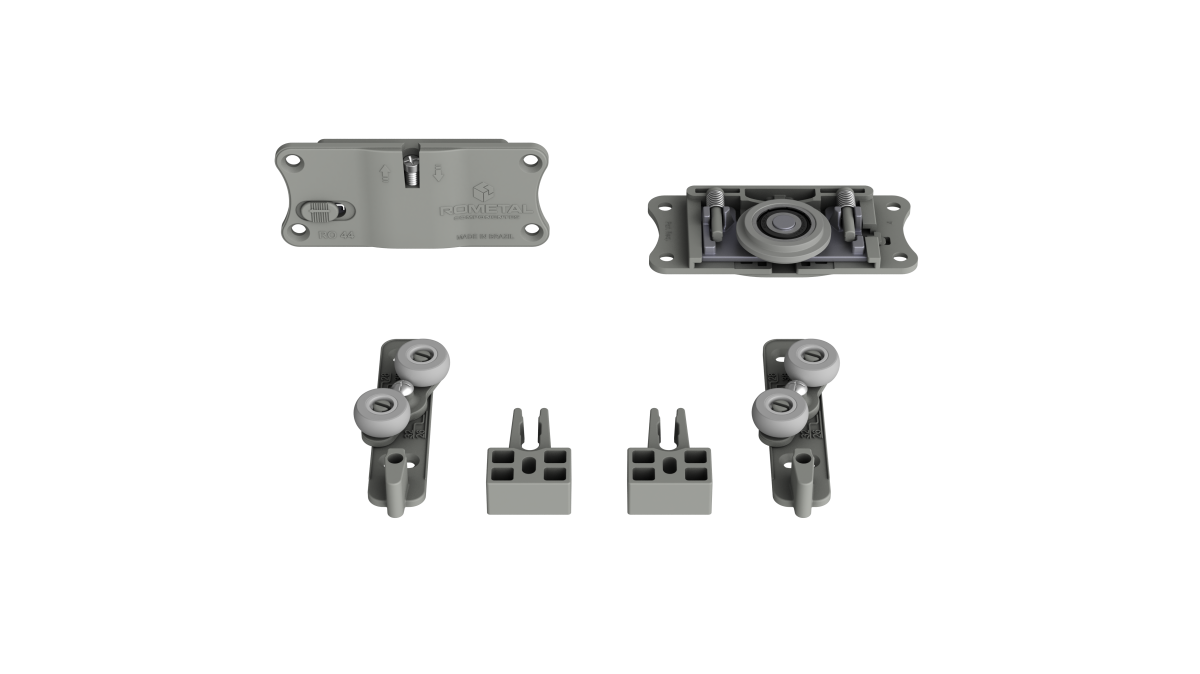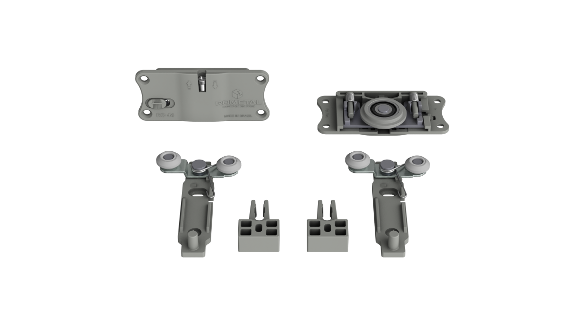 Sistema com regulagem fácil e prática. Possui molas antidescarrilamento e pode ser utilizada em portas de até 60 kg.