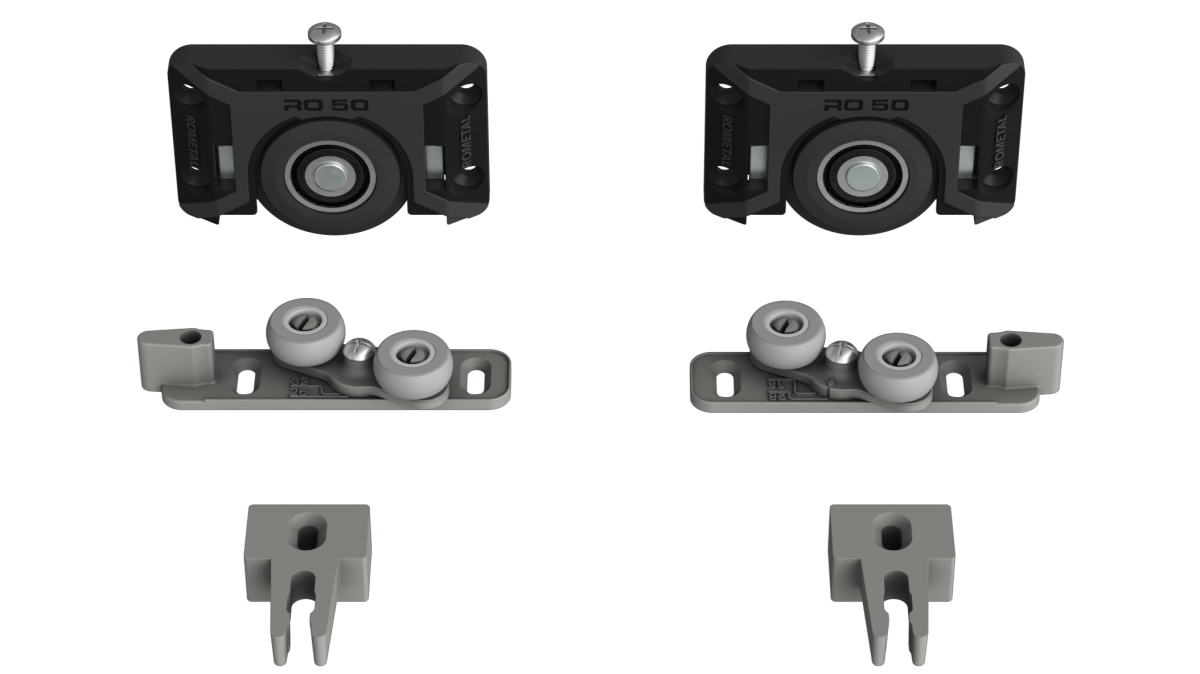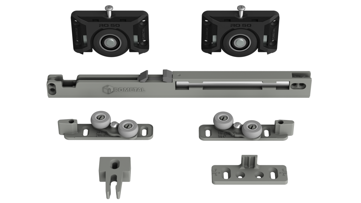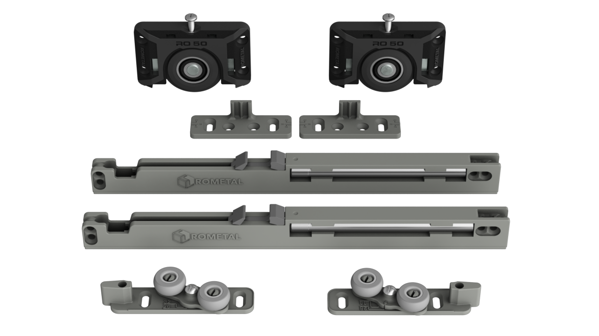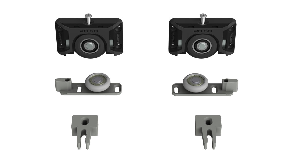 Sistema deslizante para armários. Possui molas antidescarrilamento e trava automática. Por sua fixação ser sobreposta, dispensa usinagem na porta do móvel.
