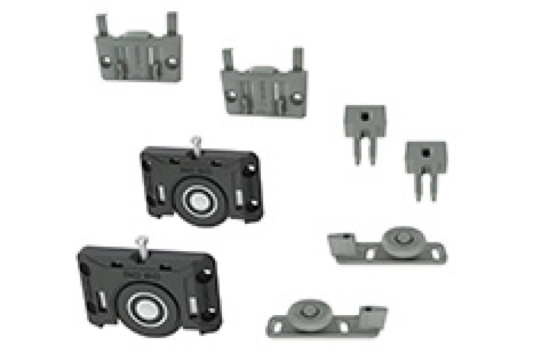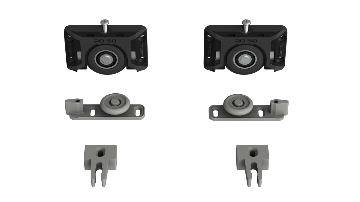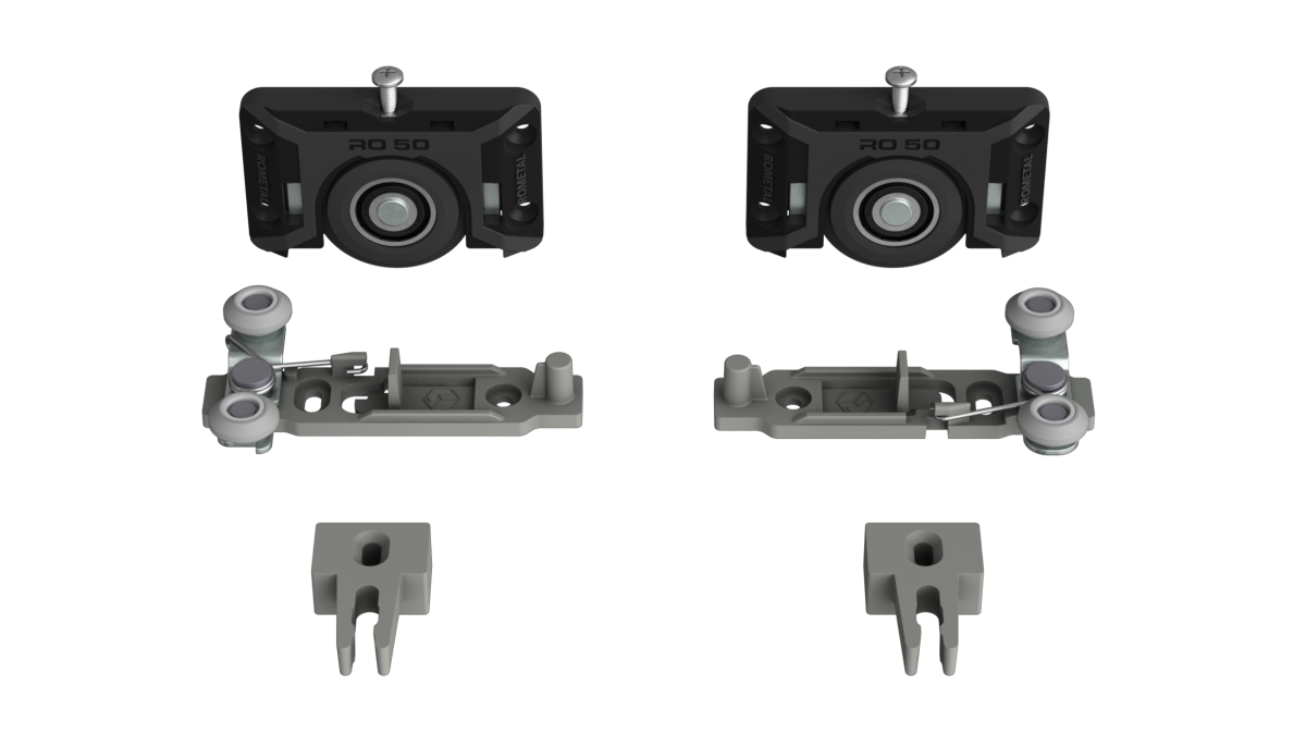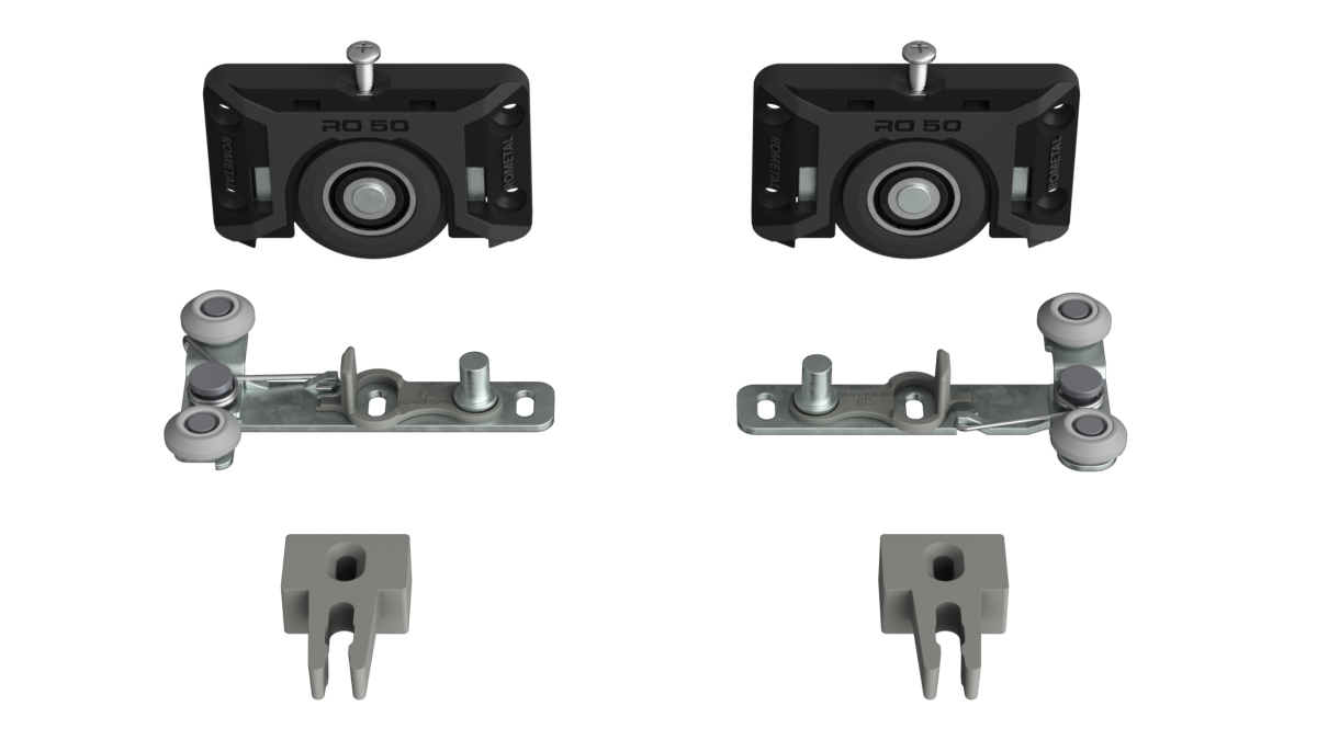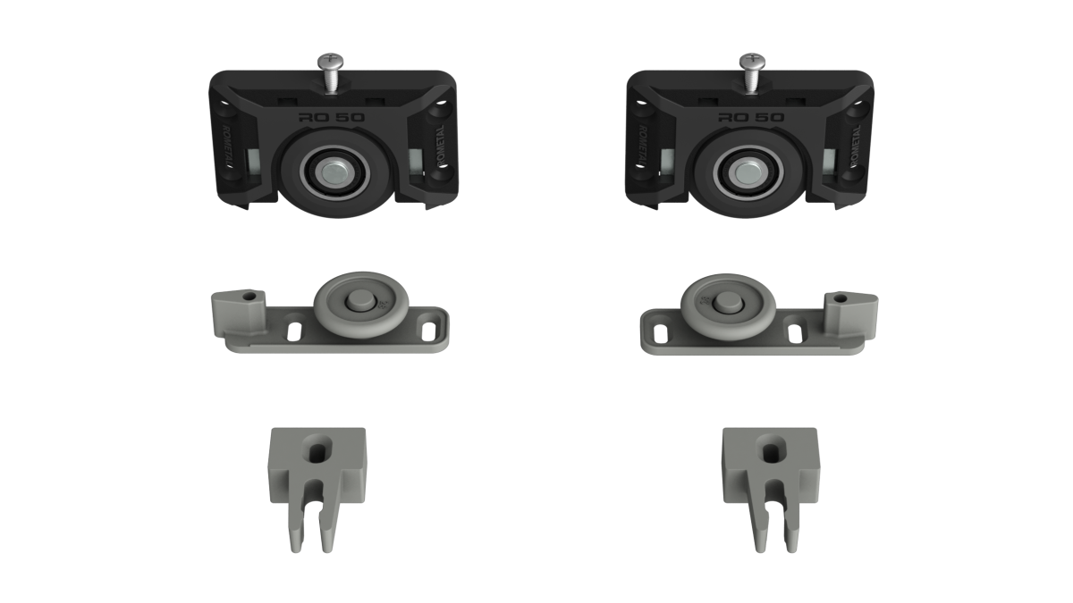 Sistema deslizante para armários. Possui molas antidescarrilamento e trava automática. Por sua fixação ser sobreposta, dispensa usinagem na porta do móvel.