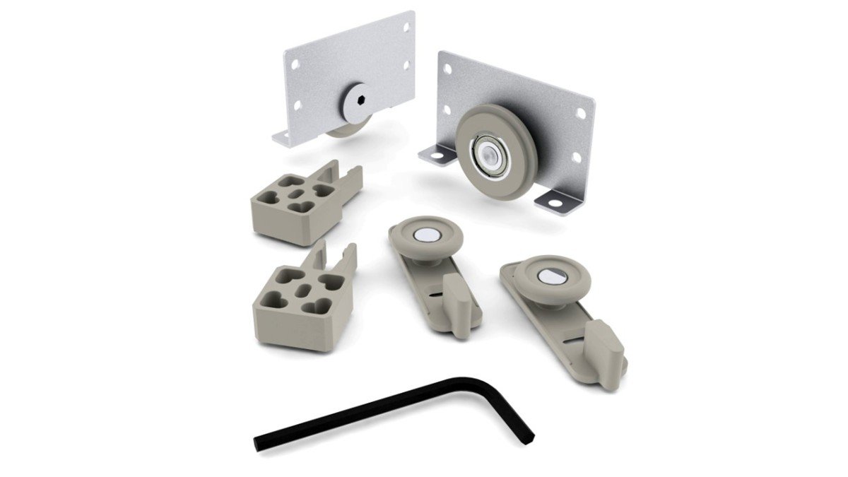 Sistema embutido para portas de madeira ou alumínio, de até 60 kg. Possui eixo excêntrico para regulagem de altura e rodízio com diâmetro de 42 mm para portas maiores.