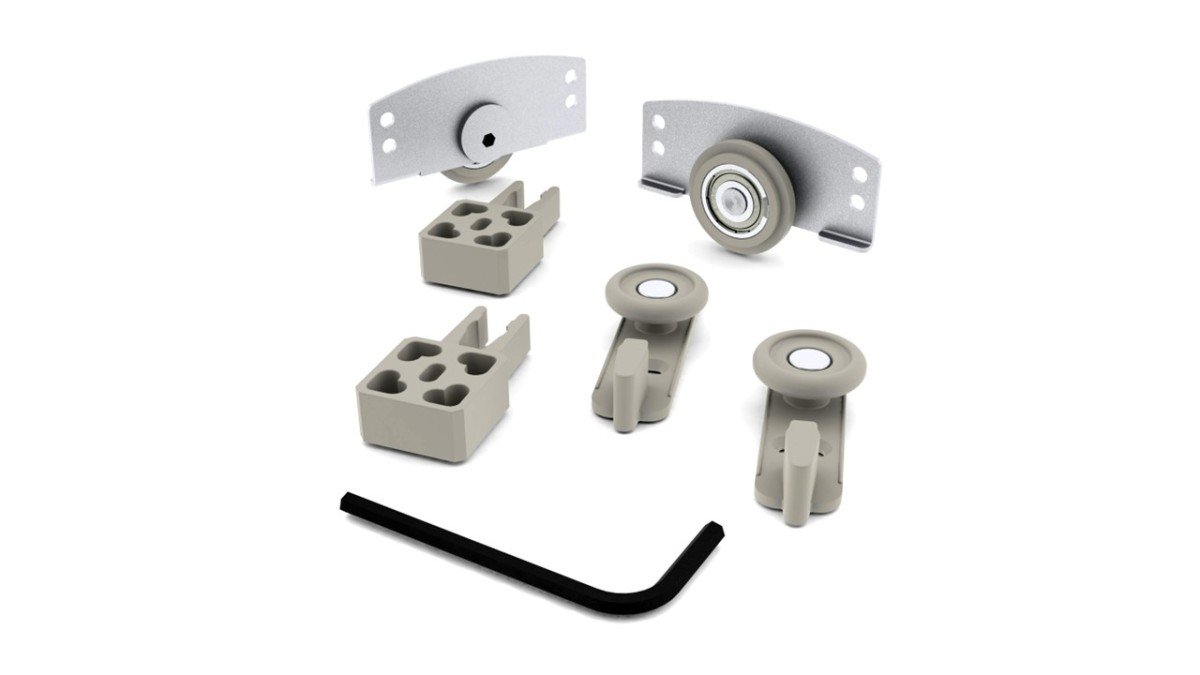Sistema embutido para portas de madeira ou alumínio, de até 60 kg. Possui eixo excêntrico para regulagem de altura e rodízio com diâmetro de 32 mm para portas intermediárias.