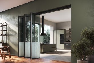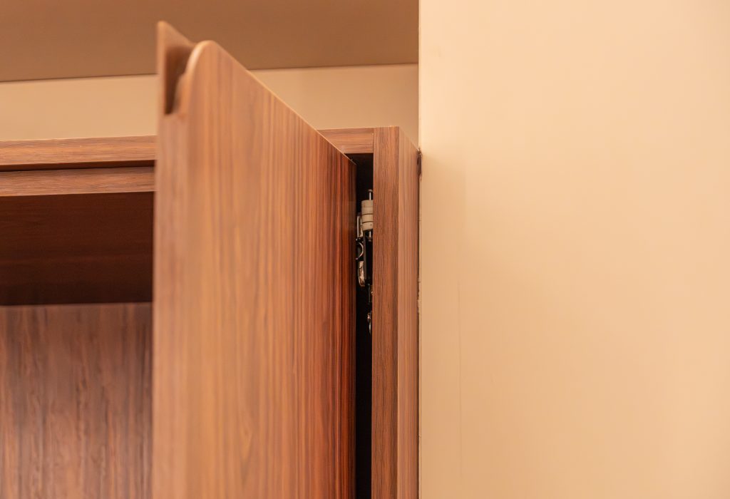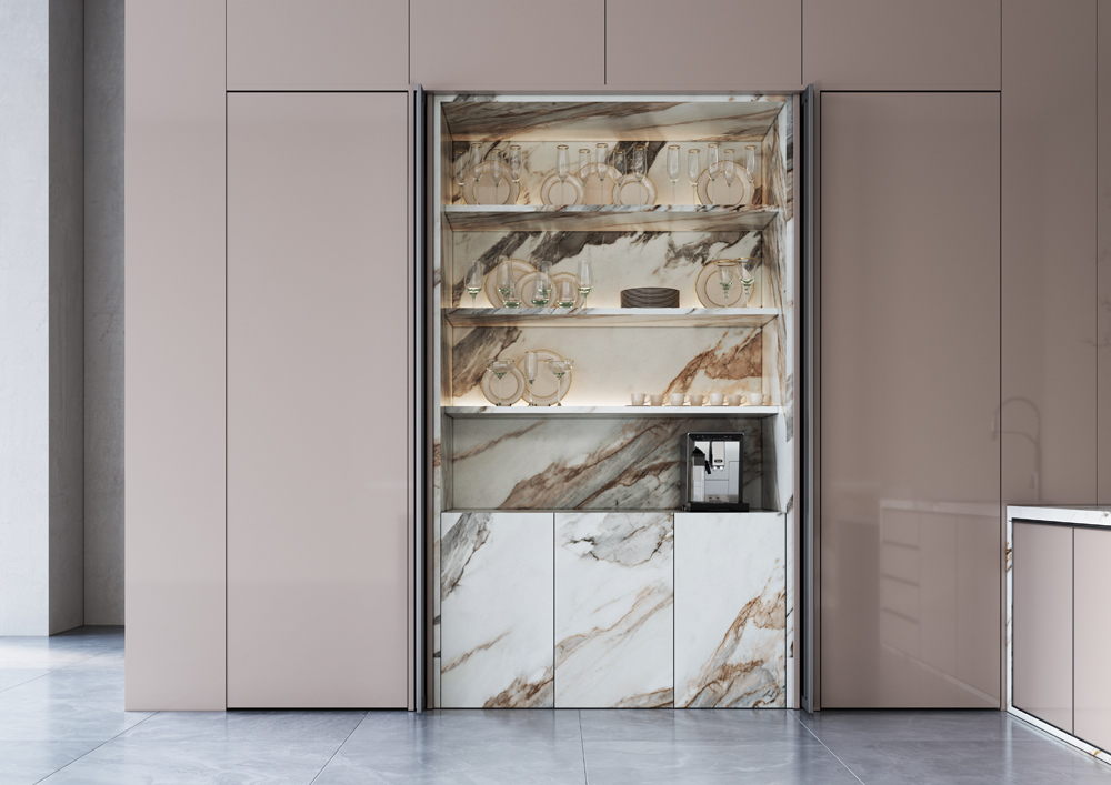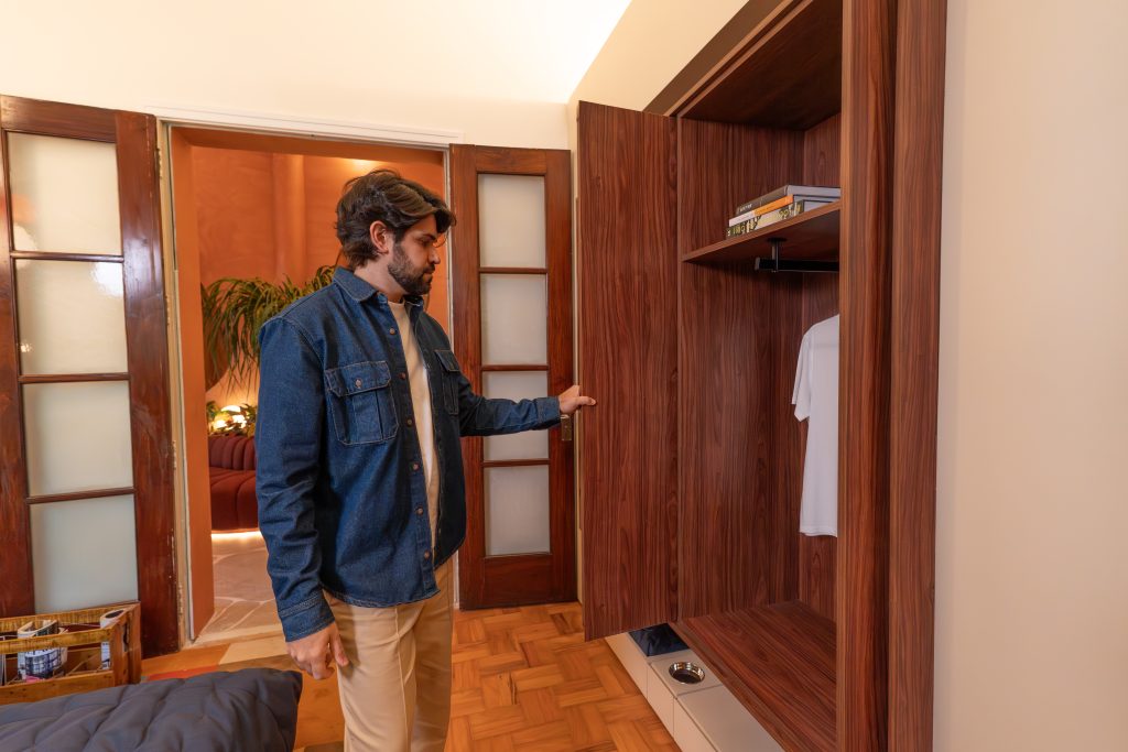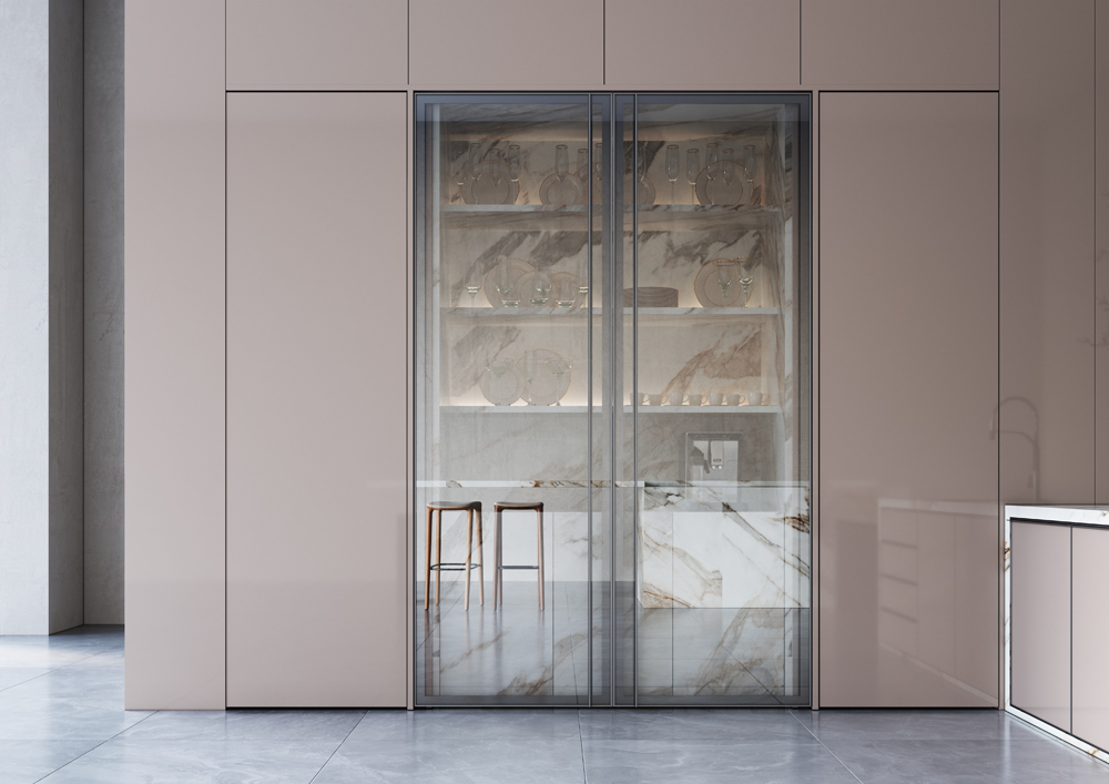 Assim como no Rivelato, o funcionamento é simples e inteligente: a porta gira por meio de dobradiças e, em seguida, desliza para dentro do móvel através de corrediças. Esse movimento escamoteável garante melhor aproveitamento do espaço e mais liberdade de circulação, já que as portas ficam totalmente recolhidas. Dessa forma, o sistema é ideal para ocultar áreas como escritórios, lavanderias ou cozinhas de apoio, proporcionando linearidade e limpeza visual quando fechado, e praticidade no uso diário quando aberto.