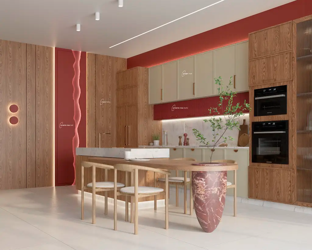 Outra tendência marcante que se mantém nos últimos anos é o uso de formas orgânicas, inspiradas em elementos naturais. Curvas, superfícies fluidas e composições que fogem das linhas rígidas aparecem em revestimentos, mobiliários e objetos.