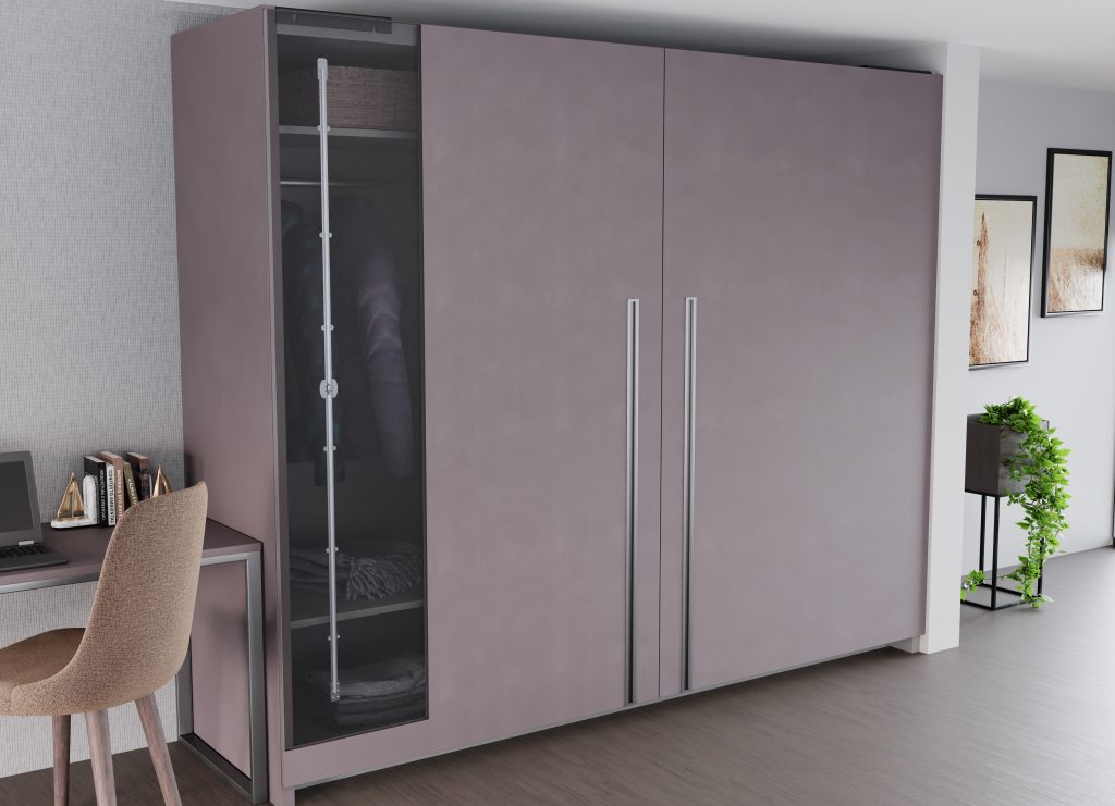O Rivelato Ampio trouxe ainda mais possibilidades para portas escamoteáveis. Agora, é possível utilizar com portas maiores, de até 2,4m de altura por 70cm de largura, sem perder a praticidade e o design. Versátil, o sistema é ideal tanto para portas de madeira quanto para portas de vidro com estrutura de alumínio. Uma solução versátil para quem busca amplitude e integração entre ambientes.