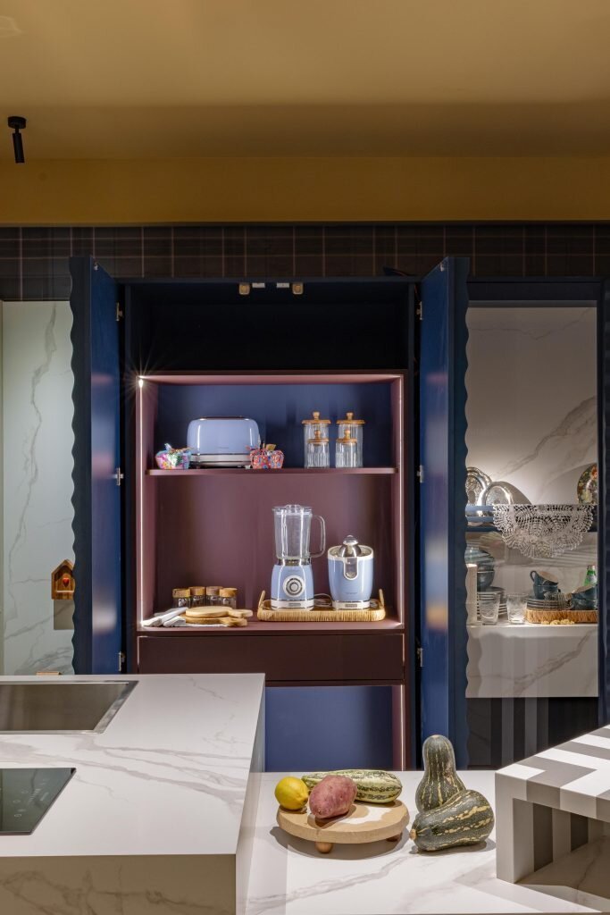 Na cozinha, o destaque fica para o sistema escamoteável Rivelato Ampio, da Rometal, que agrega inovação e praticidade ao ambiente. Desenvolvido especialmente para portas altas (de 1,5 m a 2,4 m), o sistema combina dobradiças e corrediças, permitindo que as portas girem e se recolham para dentro do móvel.