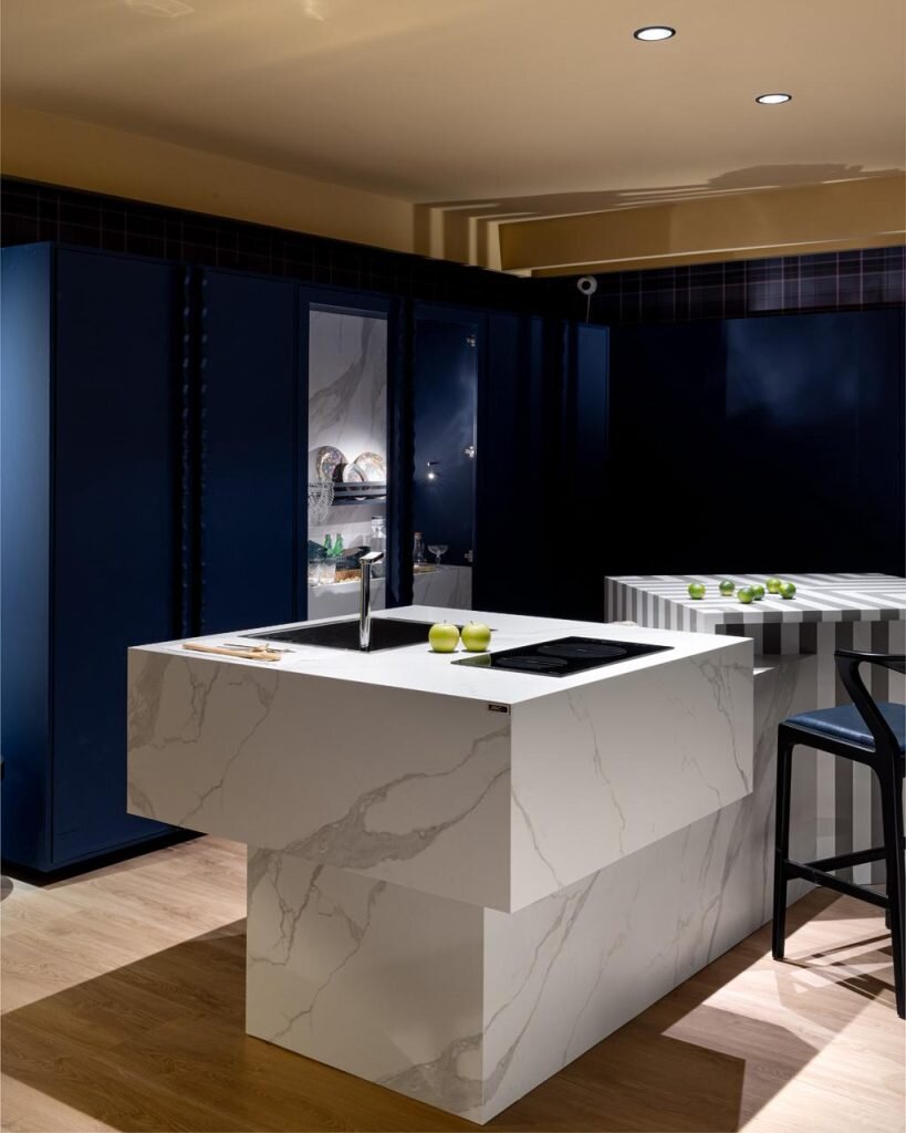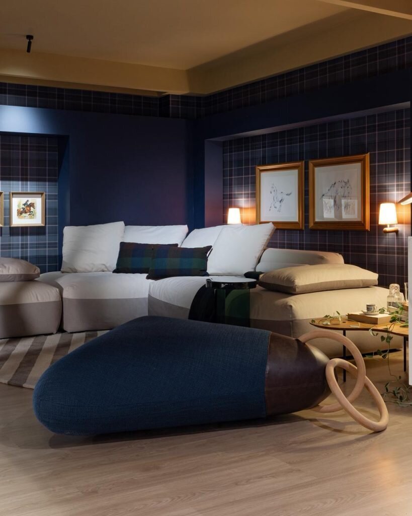 As cores desempenham papel essencial na atmosfera do ambiente. o Azul Marinho foi escolhido como protagonista por transmitir acolhimento e imponência, reforçando a personalidade marcante do projeto.