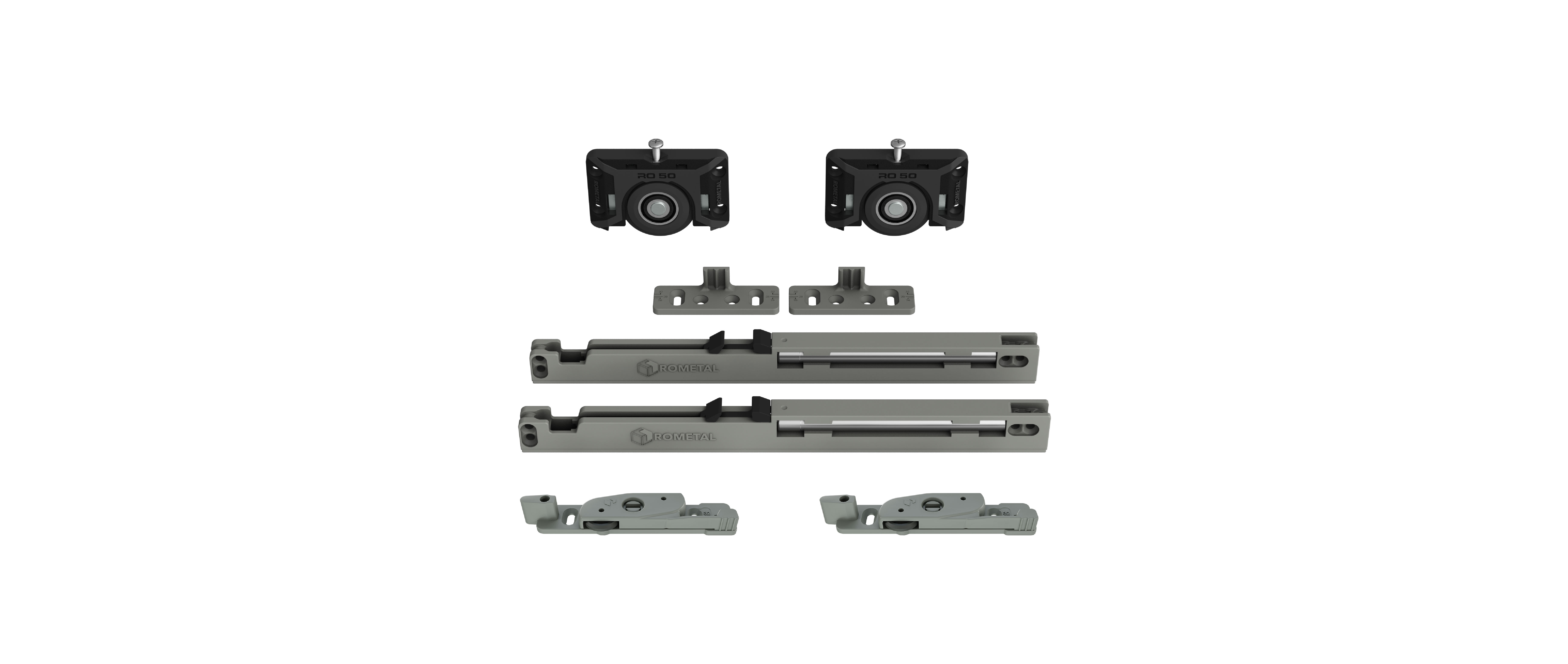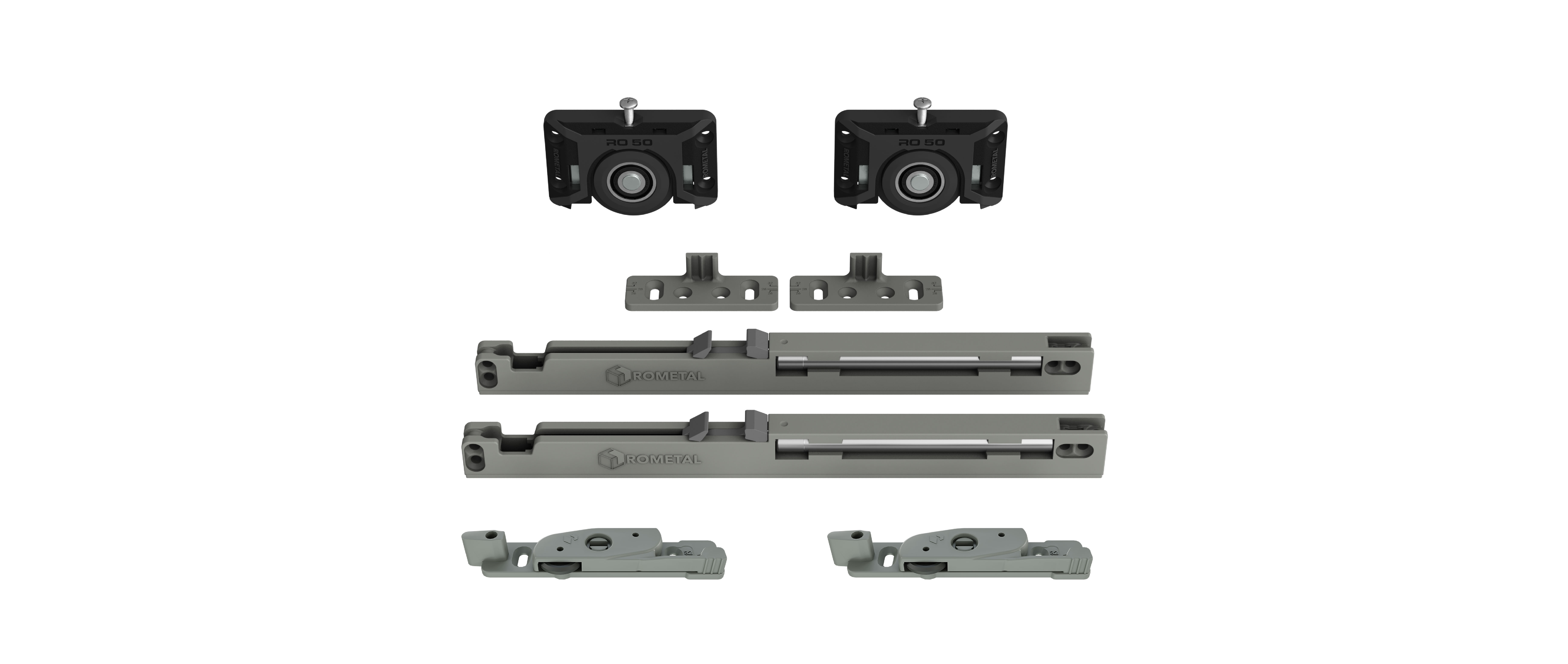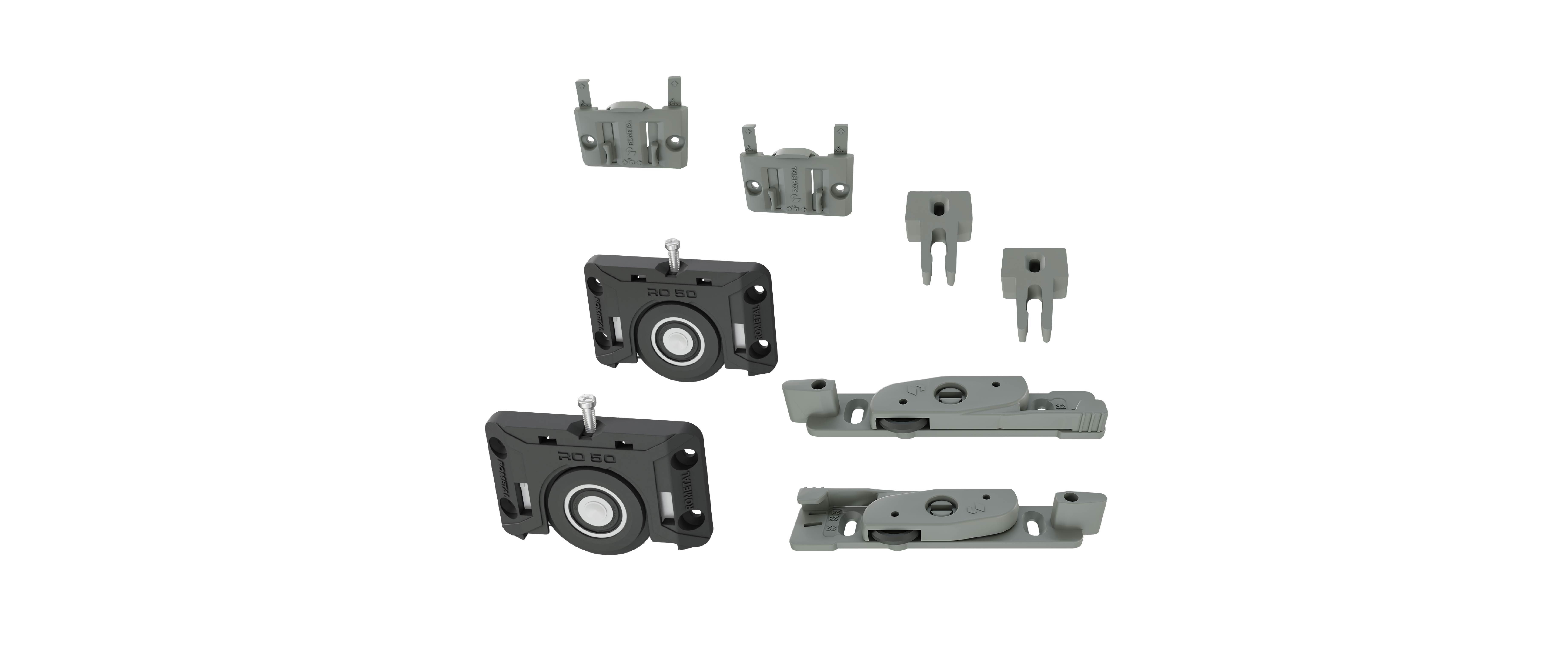 Sistema deslizante para armários. Possui molas antidescarrilamento e trava automática. Por sua fixação ser sobreposta, dispensa usinagem na porta do móvel.
