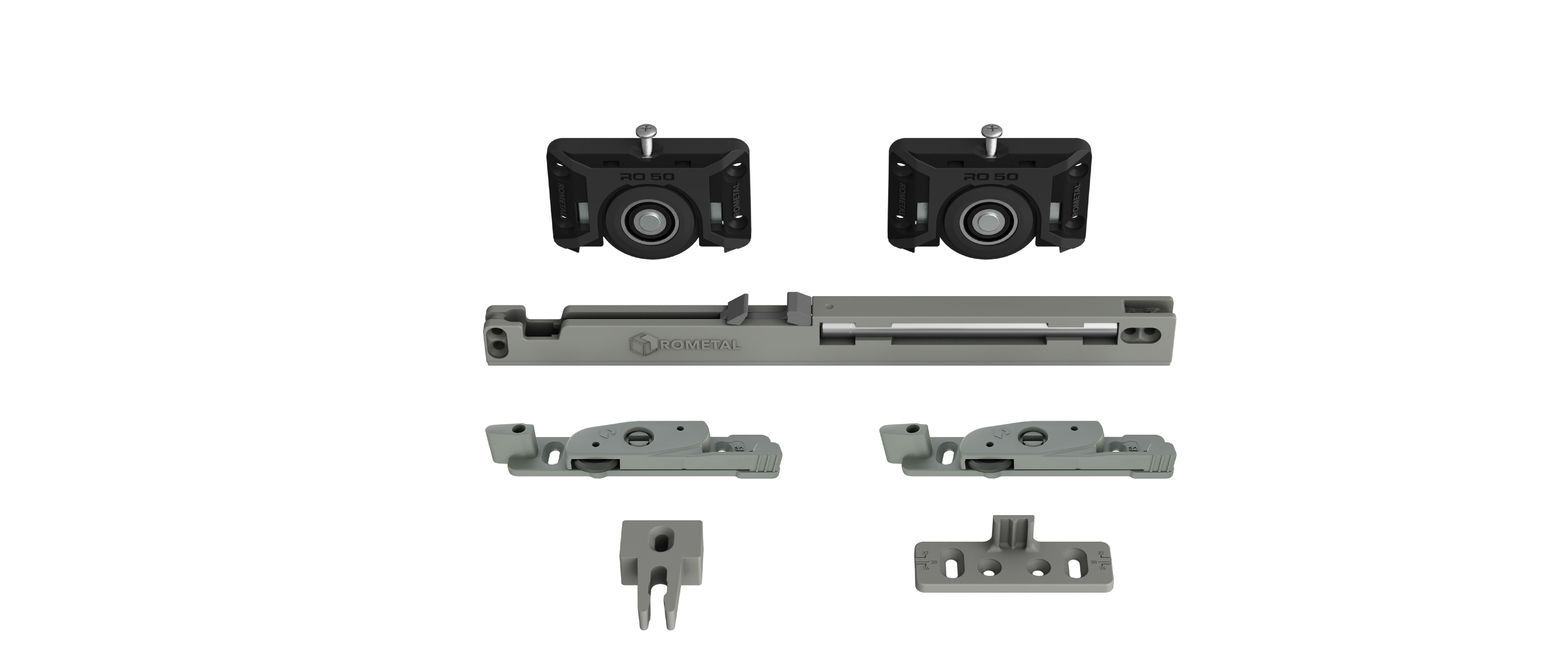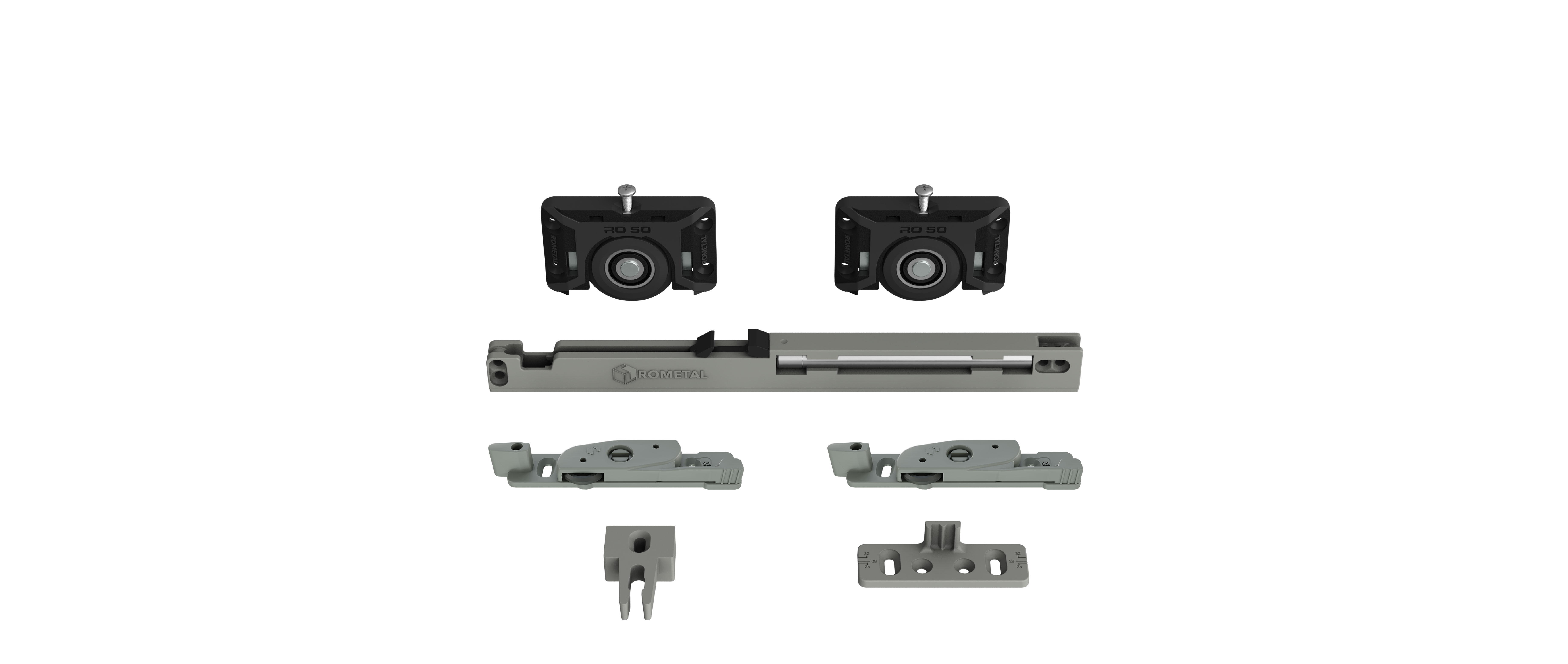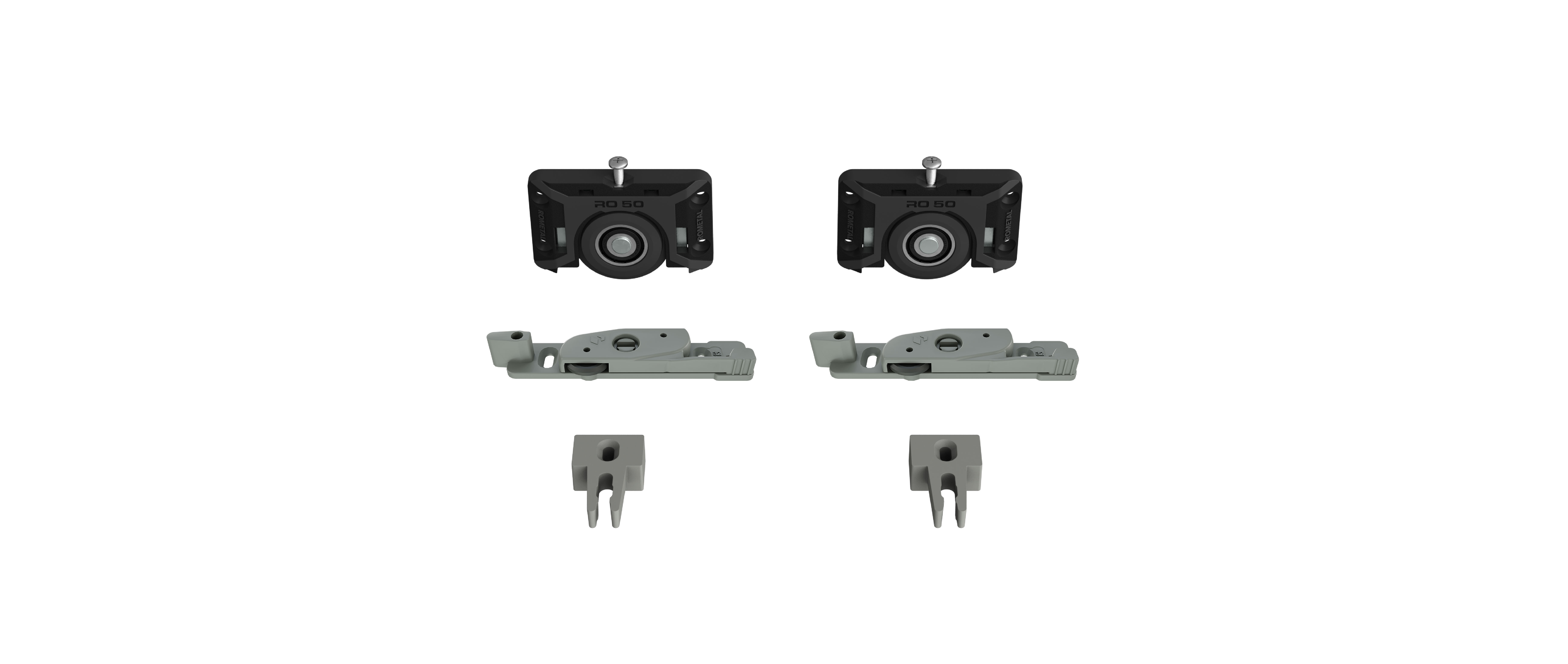 Sistema deslizante para armários. Possui molas antidescarrilamento e trava automática. Por sua fixação ser sobreposta, dispensa usinagem na porta do móvel.