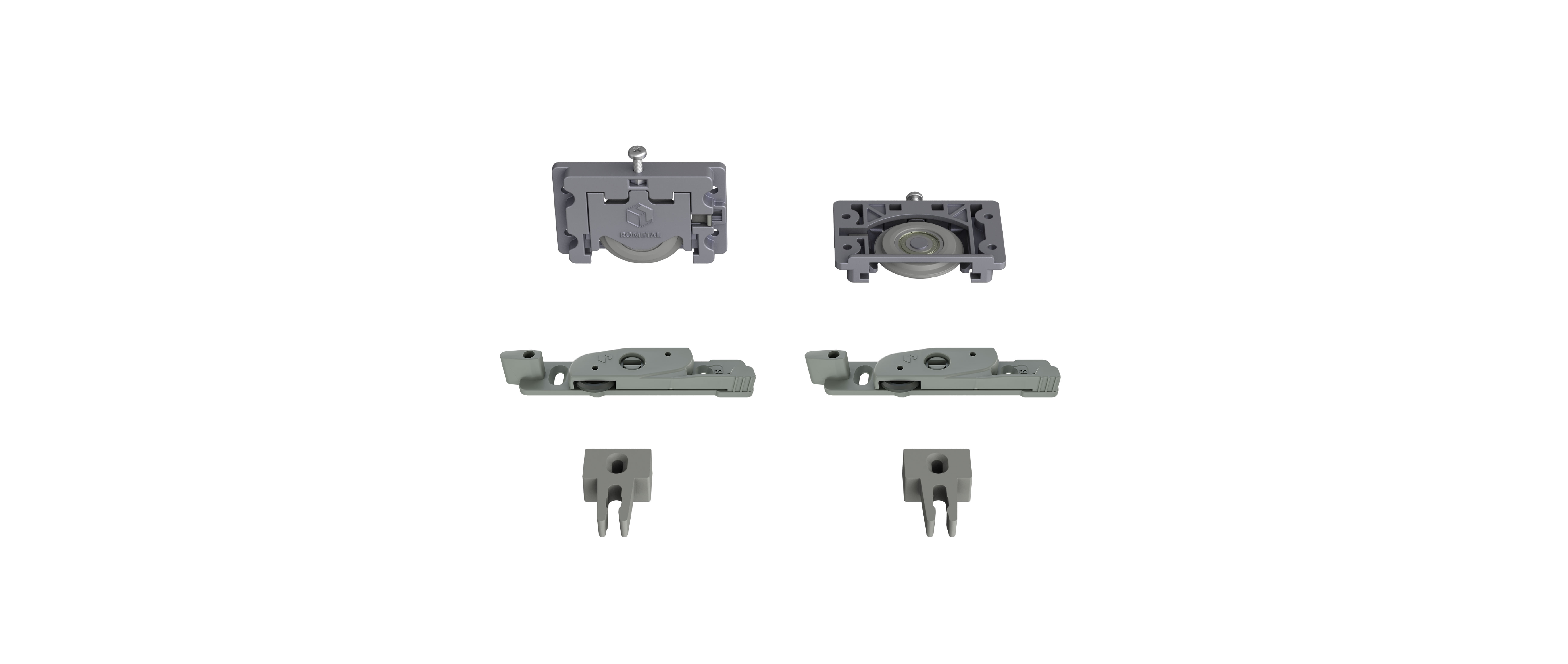 Sistema com bom acabamento, muito utilizado em armários de grande porte. Possui sistema de molas antidescarrilamento. Dispensa usinagem na porta do móvel.